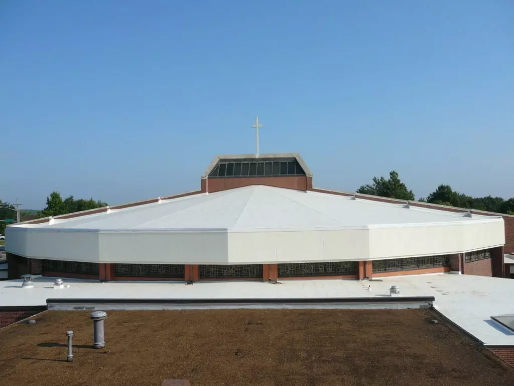 We removed the existing Hypalon roof system and installed a new Carlisle fully adhered TPO roof system. Challenges of this roof included the steepness of the slope, the circular pattern of the roof, and high visibility. The results were magnificent!
